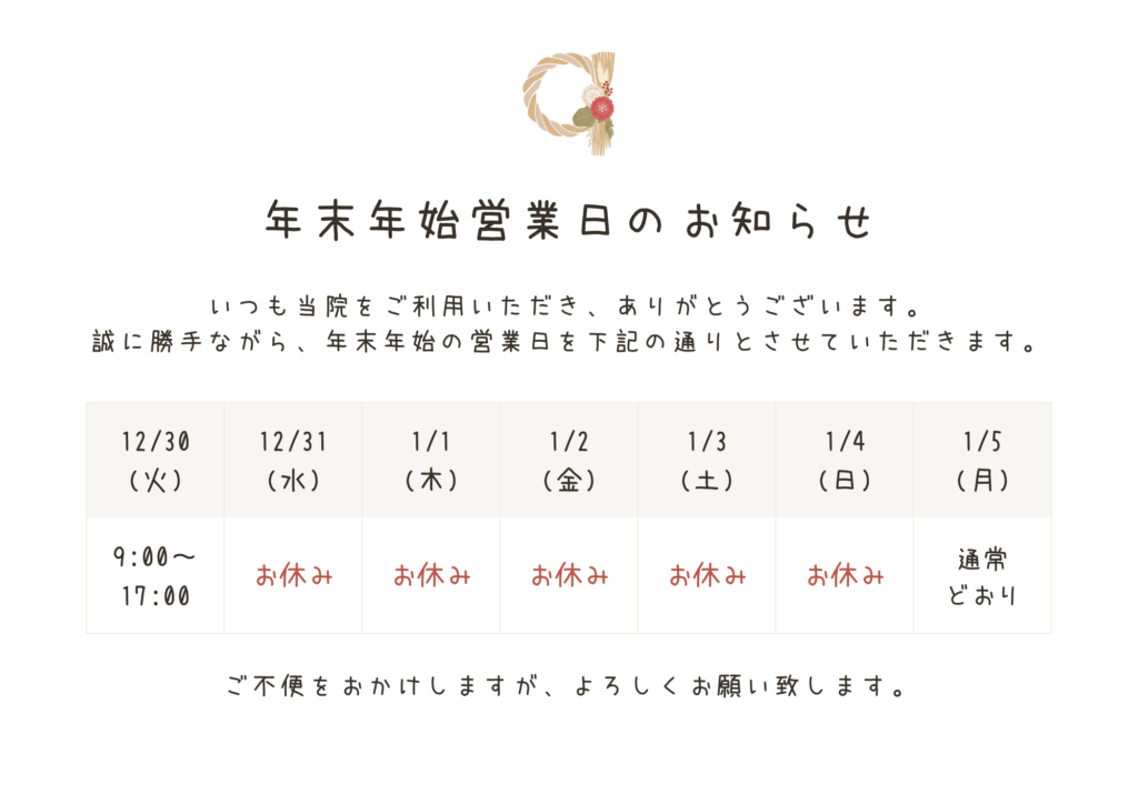 年末年始営業日のお知らせ 2025年12月1日 最終更新日時 : 2025年11月30日 tatsuya 年末年始の営業日を下記の通りとさせて頂きます。大変ご不便をお掛けしますが、宜しくお願い致します。 FacebookXBlueskyHatenaCopy